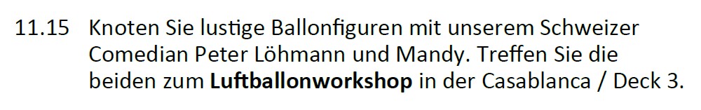 Aber auch das normale Bordleben geht weiter. Bauch-Beine-Po, Origami für Anfänger und Fortgeschrittene und nicht zu vergessen der Luftballonworkshop.