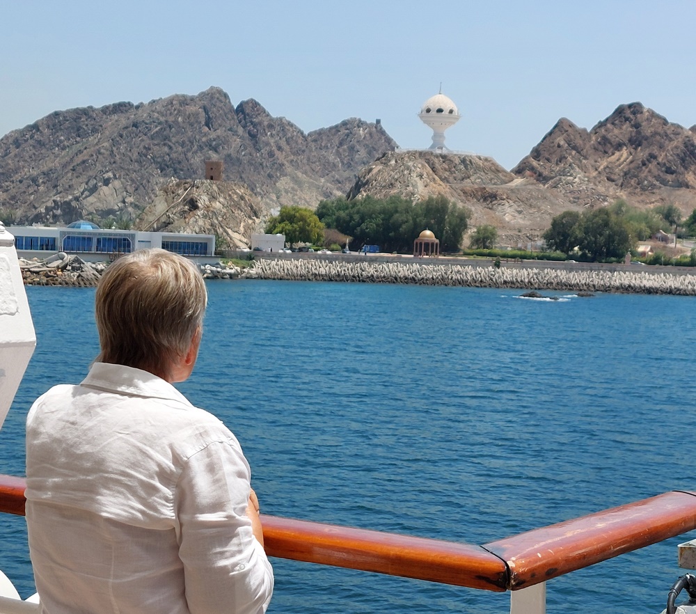 Gegen 12:00 Uhr liefen wir in den Hafen von Muscat ein. Die Einfahrt, vorbei an dem überdimensionalen Weihrauchkessel mit dem schroffen Gebirge im Hintergrund, das hat schon etwas.