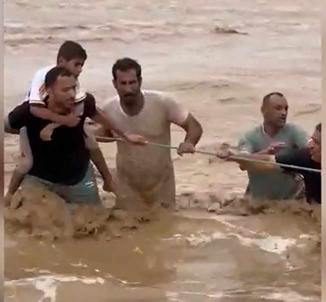 Ein Video zeigte eine Rettungsaktion, wo, mit Hilfe eines Taus, ein Mann mit einem Kind auf den Schultern mühsam aus einem reißenden Sturzbach gezogen wurde.