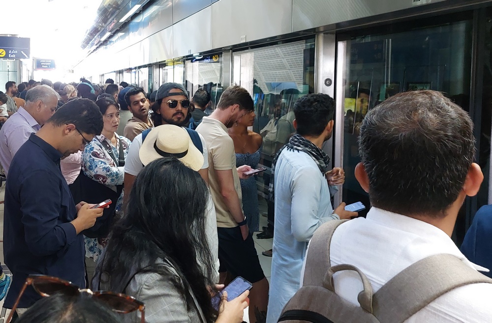 Bis zur Station Business Bay ging auch alles gut. Leider waren dort anscheinend schon mehrere Züge ausgefallen, die weiter Richtung Westen fahren sollten. Die geräumige Station war schwarz vor Menschen, die dichtgedrängt darauf warteten auf den Bahnsteig gelassen zu werden, falls irgendwann dann doch ein Zug fahren sollte.