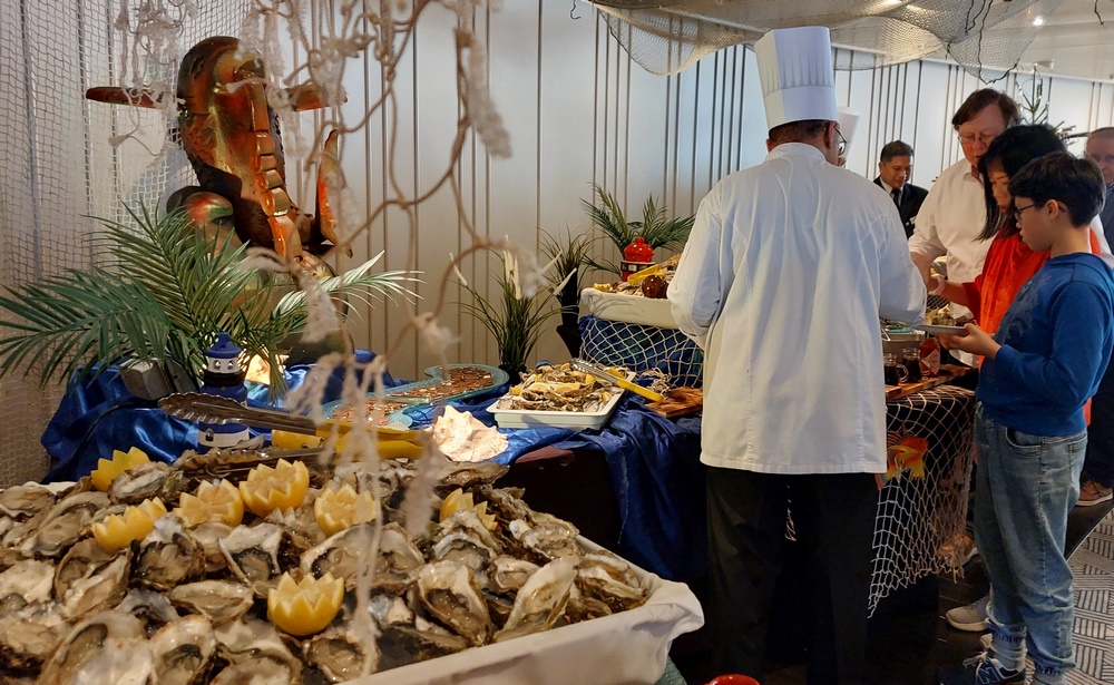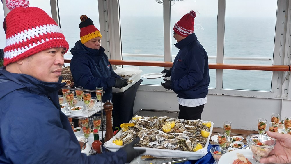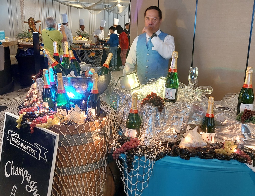 Kaum dass die Kaffeestunde um 16:30 Uhr vorbei ist, kündigt sich für 17:00 Uhr die nächste kulinarische Veranstaltung an. Die “Austern-Bar“ wurde in Harry’s Bar aufgebaut. In der Zeit von 17-19 Uhr gab es Austern gratis und Champagner für 7,90 € das Gläschen. Es bildete sich vor der Austerntheke eine lange Schlange.