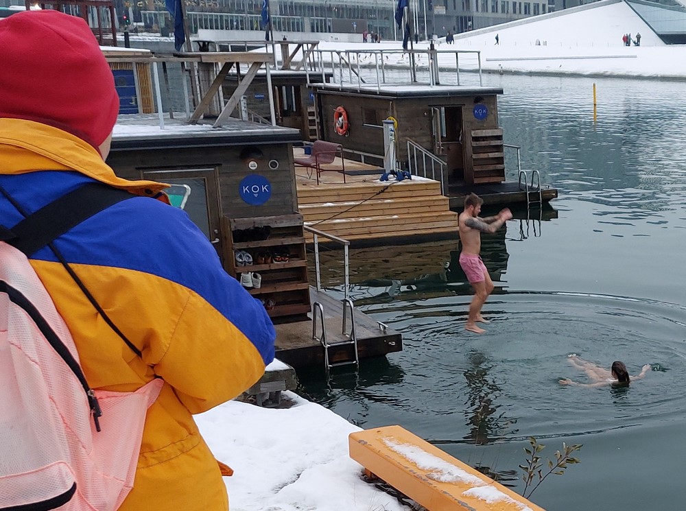 Gleich am Hafen „ankerten“ mehrere schwimmende Saunen. Mit respektvollen Schaudern konnten wir hautnah beobachten, wie sehr tapfere Menschen nach dem Saunagang ins eiskalte Wasser sprangen.