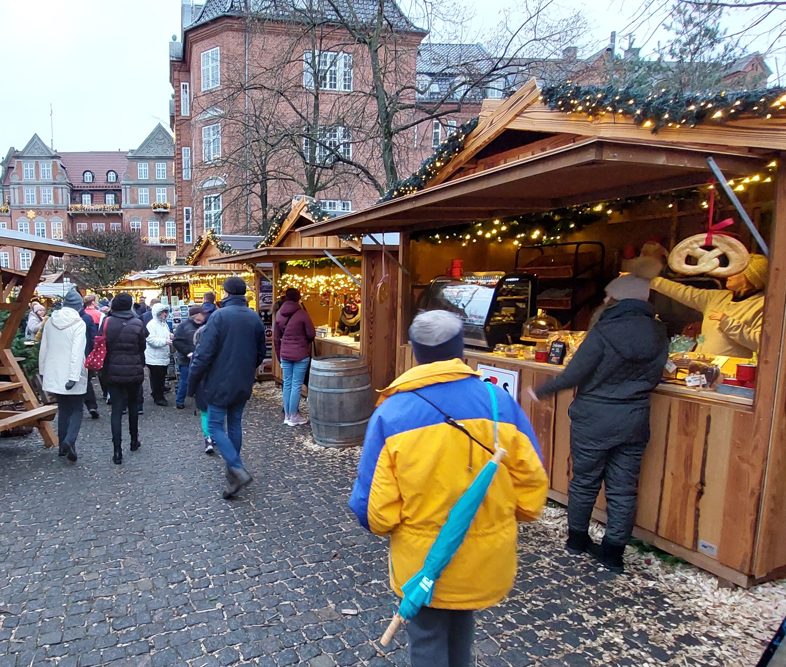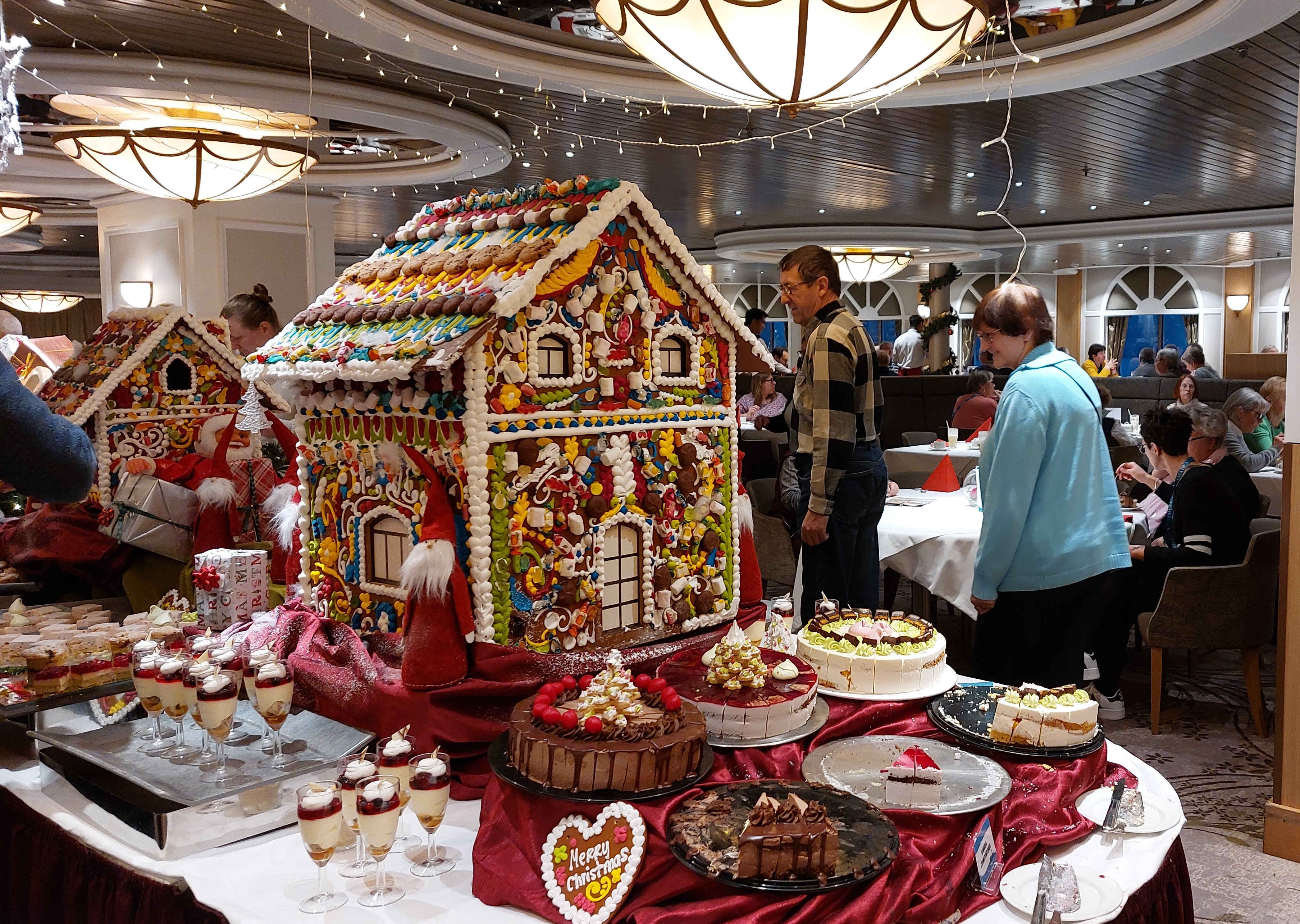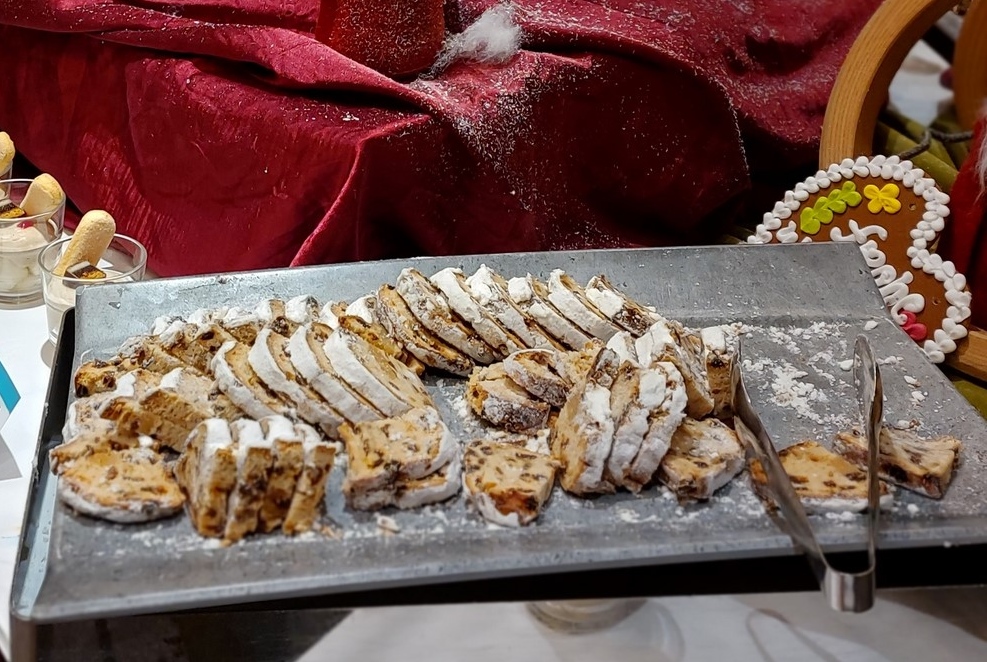 Vor den Restaurants wurden schon während der Adventszeit sehr schöne Lebkuchenhäuser aufgestellt. Jetzt war es in den vergangenen Jahren so, dass kurz vor Weihnachten und weiter über die Feiertage um diese Häuschen Dominosteine, Spekulatius und Stollen drapiert wurde. So konnte man sich an dem so dargebotenen Naschwerk gütlich tun.