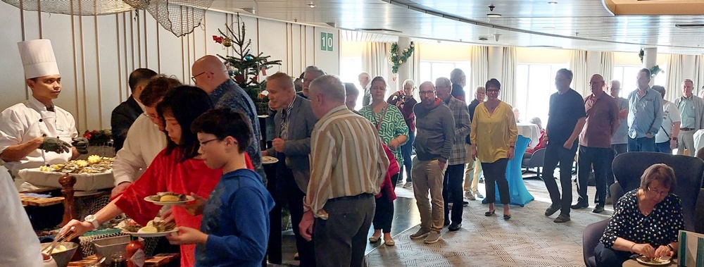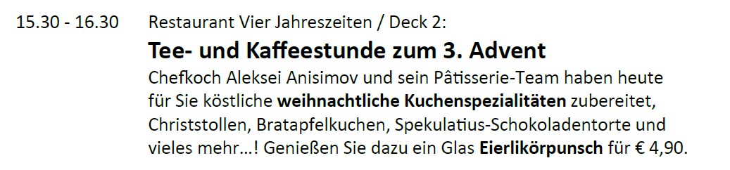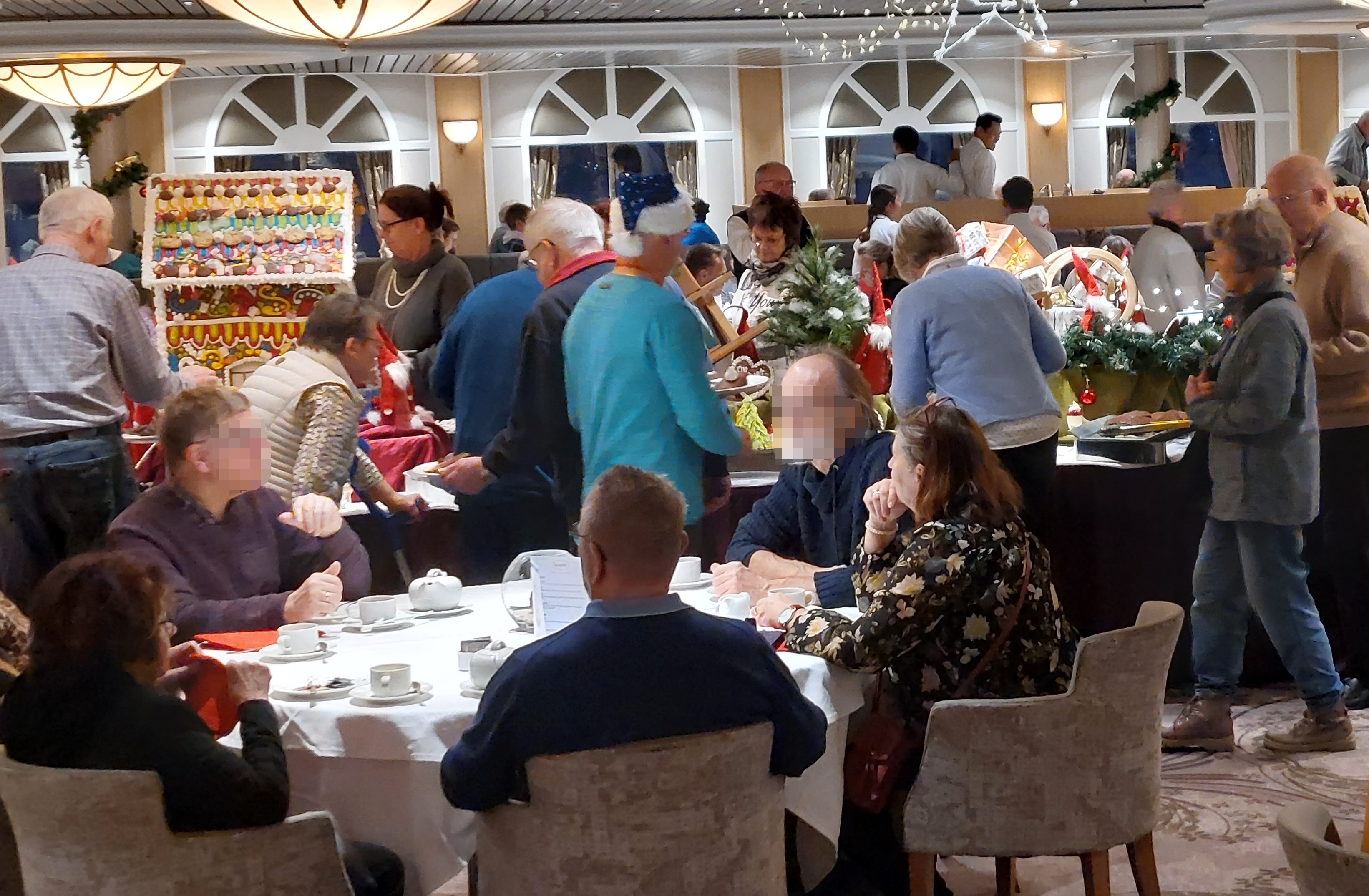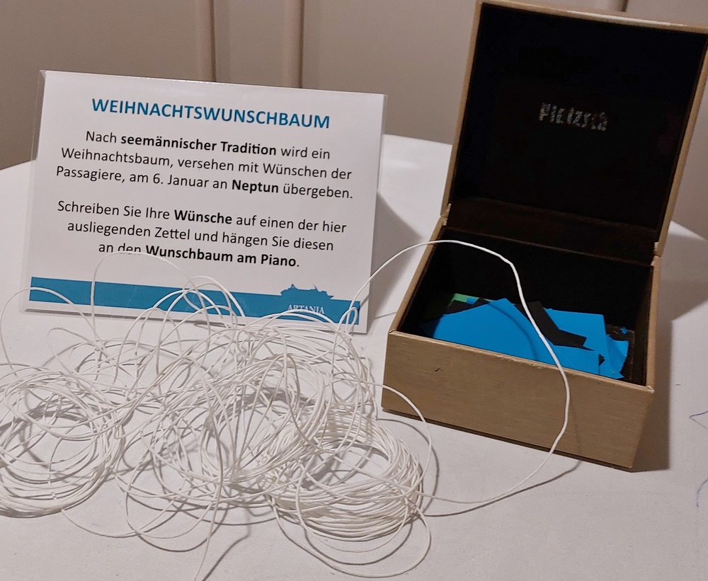 Was wir vermissen werden, ist die vorweihnachtliche Stimmung auf der ARTANIA. Da ist der Adventskaffee am Nachmittag mit Stollen, Dominosteinen und Spekulatius. Und täglich wird die Weihnachtsdeko erweitert, einschließlich des Aufstellens und Schmücken des großen Weihnachtsbaums im Foyer und dem Aufbau der elektrischen Eisenbahn, die den Baum dann umrunden wird.