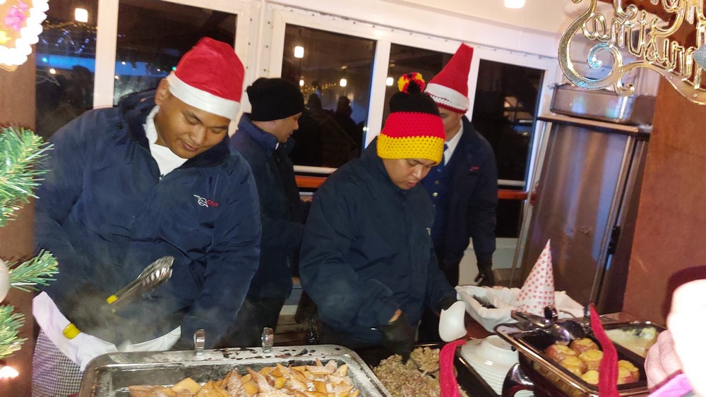 Zum Galadinner am Abend stand die traditionelle Weihnachtsgans auf der Speisekarte. Aber die Frage war heute nicht - zumindest nicht im Lido-Büfett-Restaurant - Brust oder Keule? Vielmehr war das Fleisch bereits von den Knochen gelöst. Das sah zwar nicht gans ganz so schön aus, aber es schmeckte hervorragend. Und wenn wir Essensnörgler so was schon mal sagen ….
