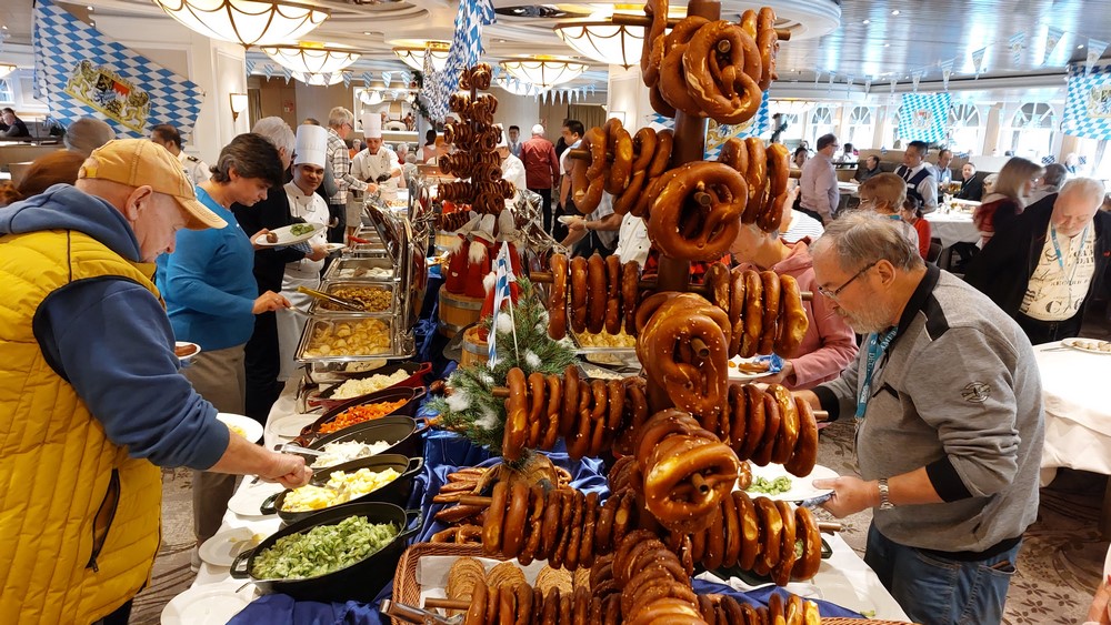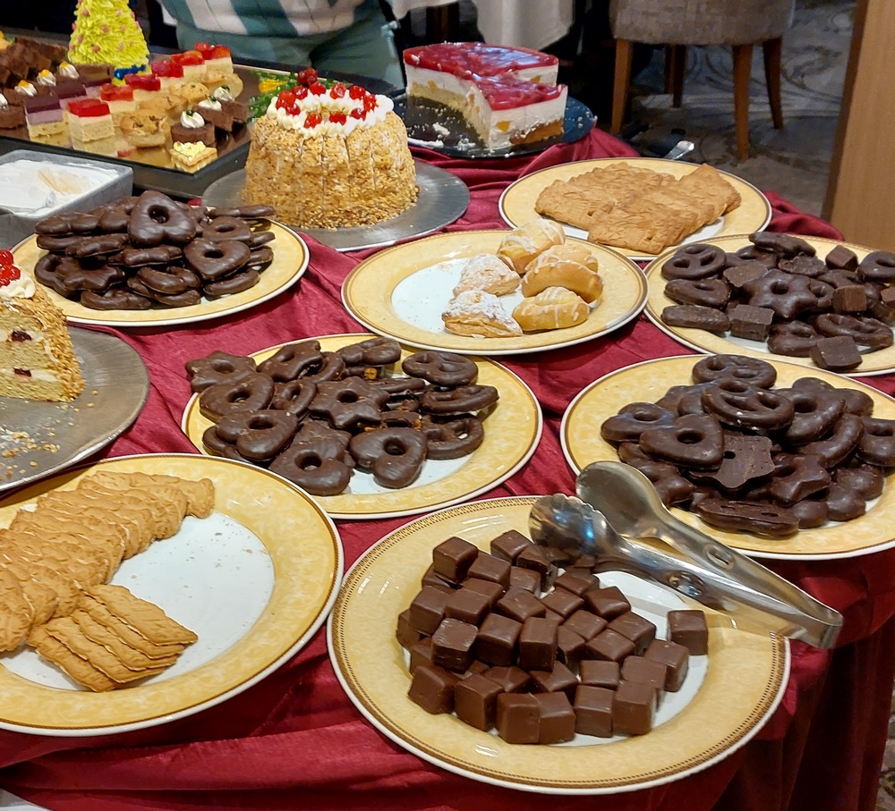 Zur Organisation des Kuchenbuffets muss man wissen, dass die Gäste sich die Kuchen, Törtchen und Plunderstückchen selbst mit Servierzangen vom Buffet auf dieTeller bugsiert. Ausnahmen bilden die Torten. Diese sind an den beiden Buffet-Enden platziert und werden von einer Kellnerin oder Kellner geschnitten und dem Gast, wenn er ein solches Stück wünscht, auf den Teller gelegt. Dies ist durchaus sinnvoll, denn diese Aktion ist, wenn vom Passagier selbst durchgeführt, viel zu unfallträchtig.
