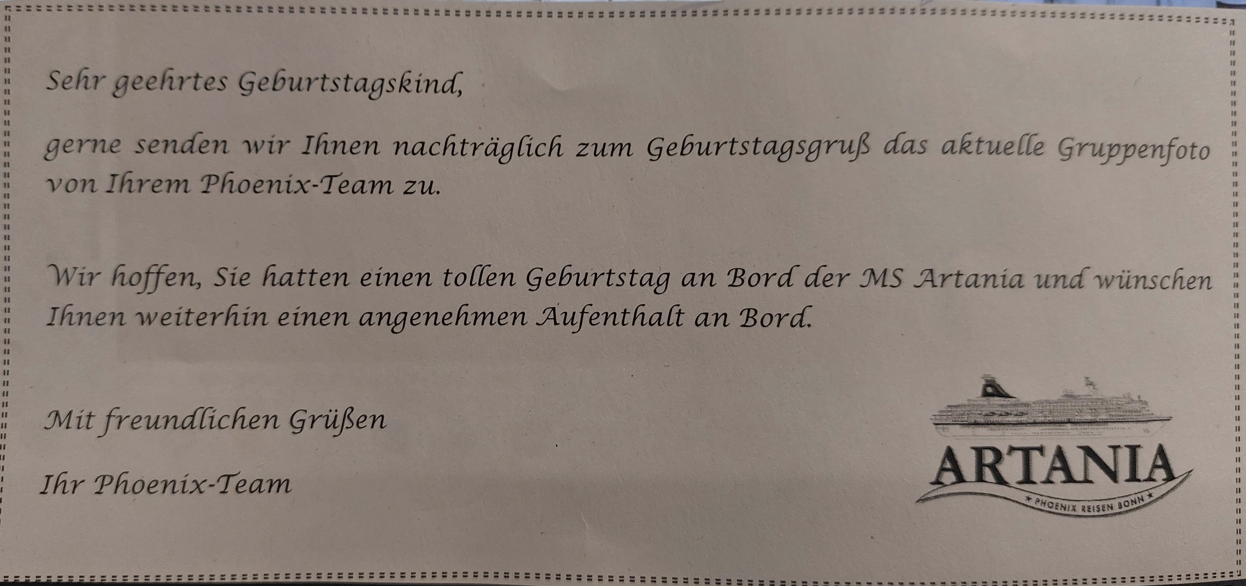 Am 22.12.2023, am Vorabend des Endes der Winterreise und auch der Vorabend meines Geburtstags, fand ich in der Kabine ein Geburtstagskärtchen vom Kreuzfahrtdirektor Klaus Gruschka und dem Kapitän Alex Zinkovskyi unterschrieben, ein Foto von allen Phoenix-MitarbeiterInnen an Bord und eine Flasche Phoenix-Sekt.