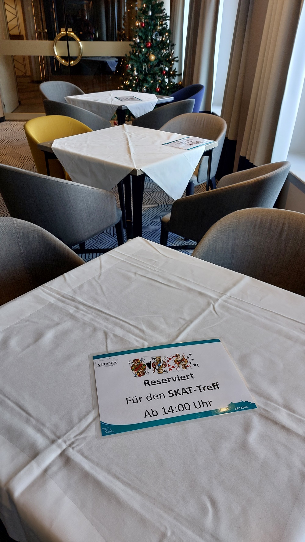 An Seetagen wird auf der ARTANIA immer ein mehrtätiges Skatturnier durchgeführt. Hierfür werden ab 14:00 Uhr (bis ca. 17:00 Uhr) je nach Bedarf 4 bis 6 der 8 vorhandenen Tische für die Skatspieler reserviert.