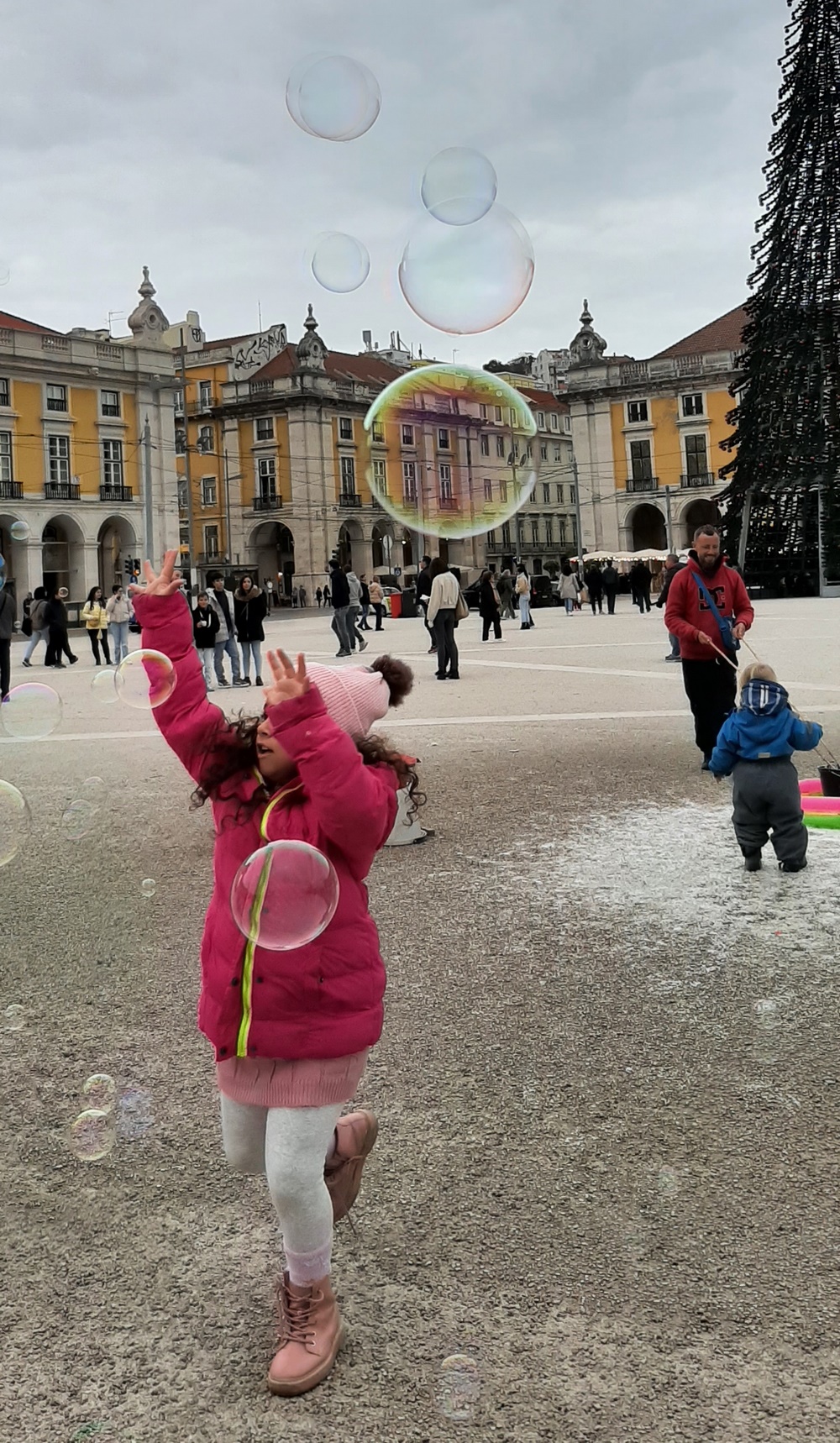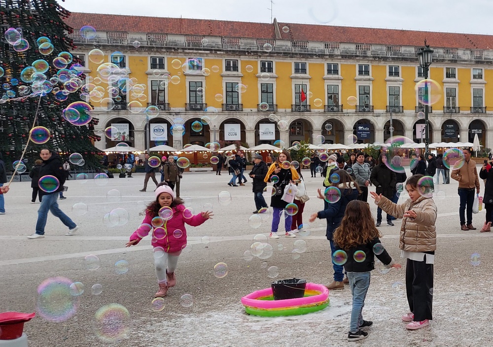Wieder zurück am Praca do Commercio war ein Seifenblasen-Performer zugange, der von einer großen faszinierten Kinderschar umringt war. Auch uns Alten zog er mit seinen Unmengen von bunten Seifenblasen in seinen Bann und wir gaben gerne unseren Obolus in den dafür vorgesehenen Hut.