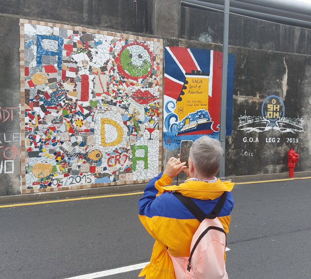 Etwas Gutes hatte die "falsche" Pier. An einer ca. 500 Meter langen Wand hatten die Crews von unzähligen Schiffen sehenswerte Graffities hinterlassen. Hier eine "Hinterlassenschaft" eines AIDA-Kreuzfahrtschiffs.