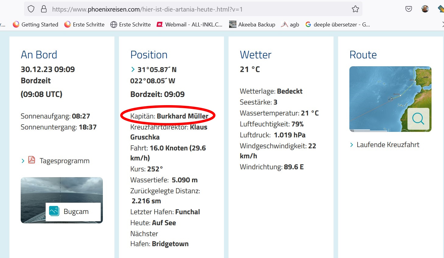 Ein Blick auf die Phoenix-Seite „Hier ist die ARTANIA heute“ weist tatsächlich einen Burkardt Müller als Kapitän aus und nicht mehr, wie bisher auf der Reise, Alex Zinkovskyi.