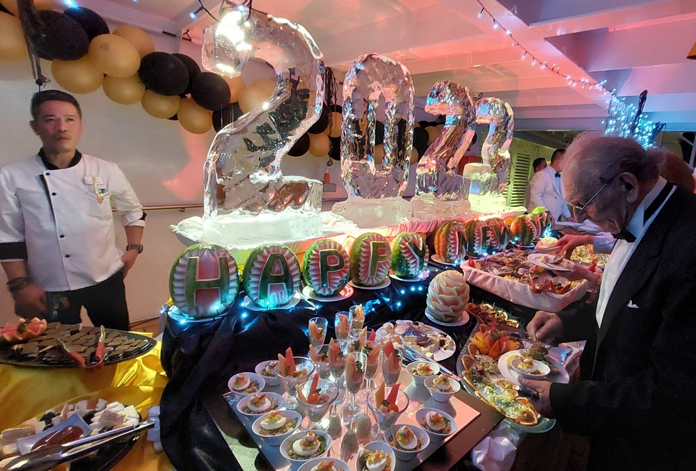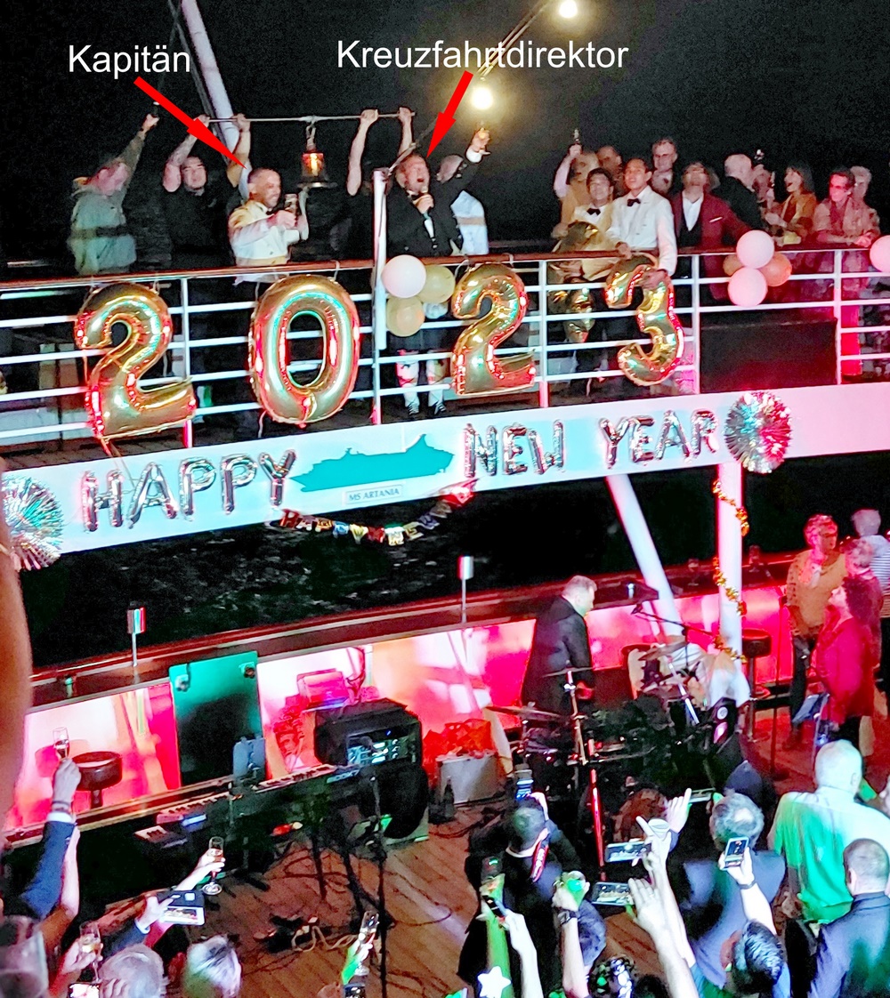 Am Abend des 23.12., dem Beginn der Weltreise, hat der Gratulations-Algorithmus der Bordreiseleitung erneut grünes Licht für eine Gratulationskur ausgelöst. Geliefert wurden wiederum das vom Kapitän und dem Cruisedirektor unterschriebene Kärtchen und eine Flasche Sekt, allerdings kein Foto mit den Phoenix-MitarbeiterInnen.