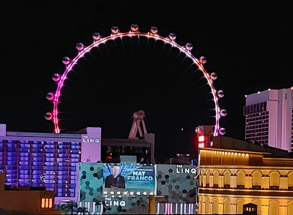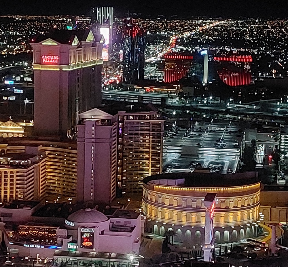 Aber es hatte sich gelohnt, zum einen, weil wir als 65+-Menschen 20% Rabatt erhielten und der Ausblick bei Dunkelheit über den bunt erleuchteten Strip fantastisch war.