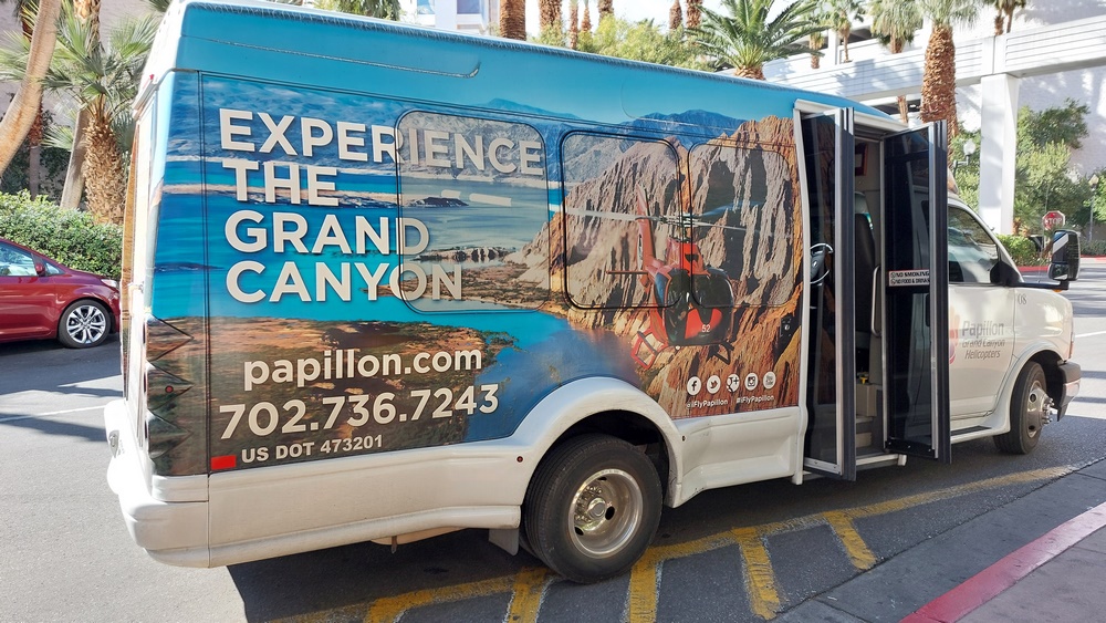 So würde morgen die Abholung zu unserem Helikopterflug über und in den Grand Canyon mit „Harrah’s tour bus area“ angegeben.