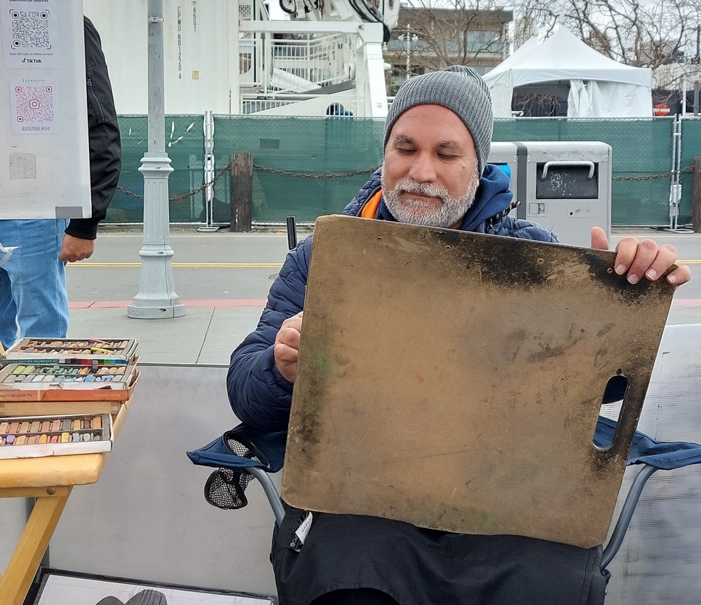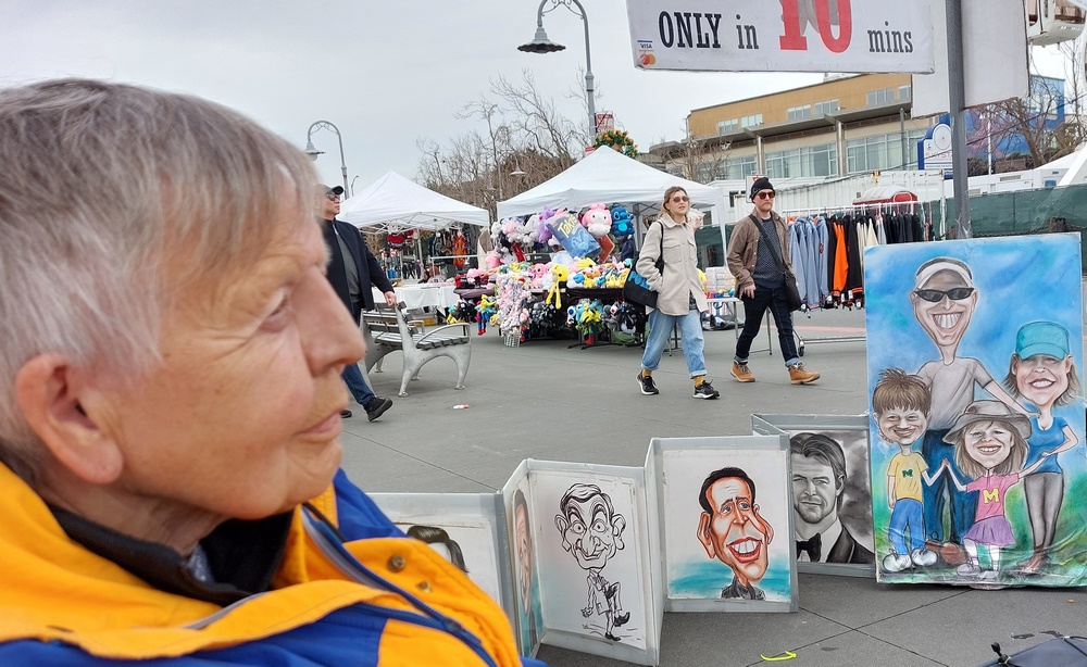 Auf halber Strecke von den Seelöwen zum Flipperautomaten hatte ein Zeichner seinen Stand aufgebaut. „Karikatur in 10 Minuten für 10 Dollar“.