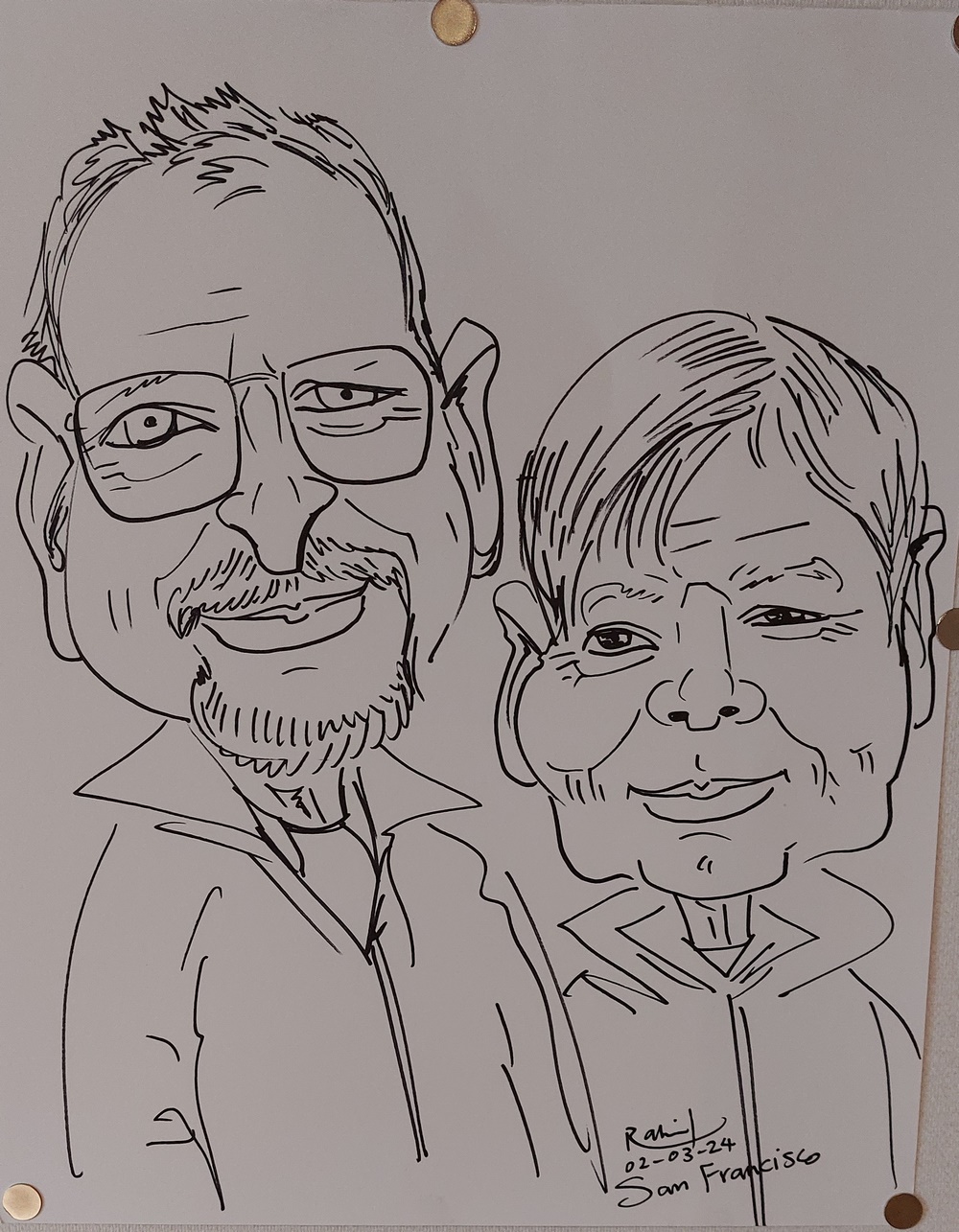 Wir hatten uns 1992 schon einmal karikieren lassen, das Werk hängt seitdem gerahmt bei uns zu Hause im Flur. Damals mussten wir lernen, dass der angegeben Preis sich auf den zu zeichnenden Kopf bezieht und nicht auf das Bild. Das heißt, lässt man sich zusammen zeichnen, kostet das das Doppelte.