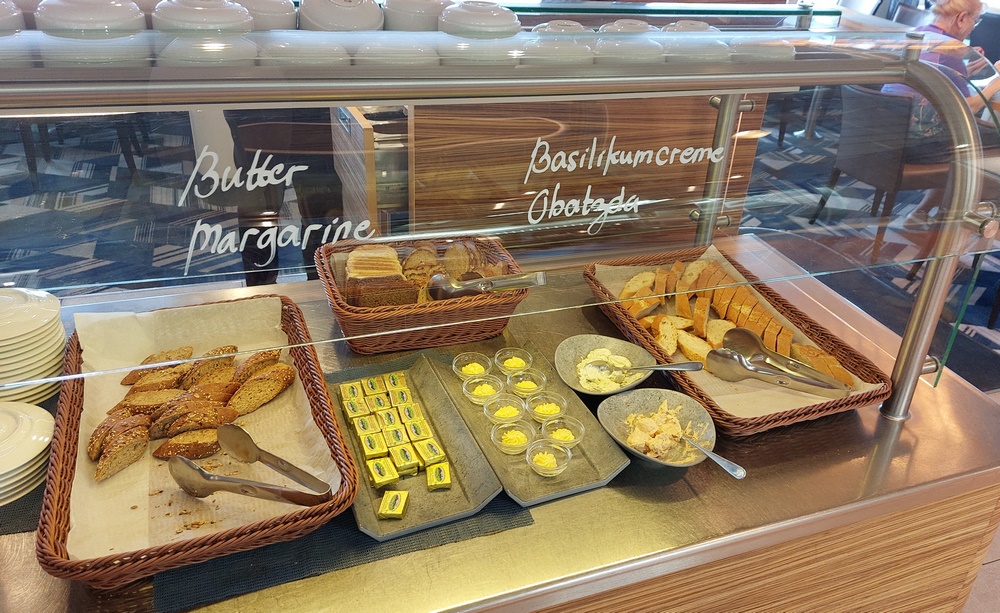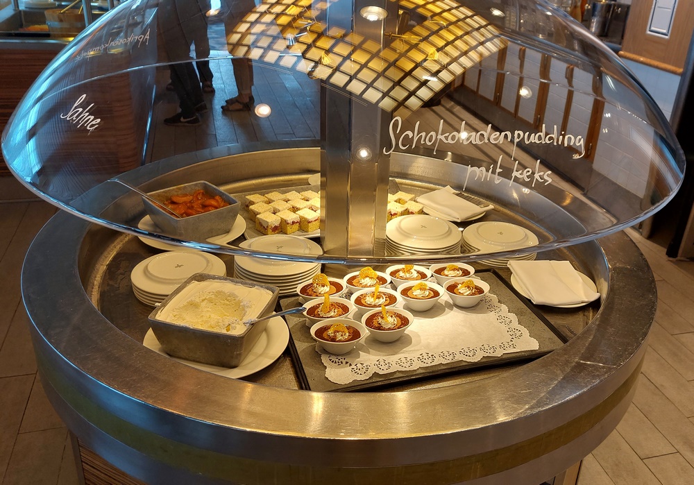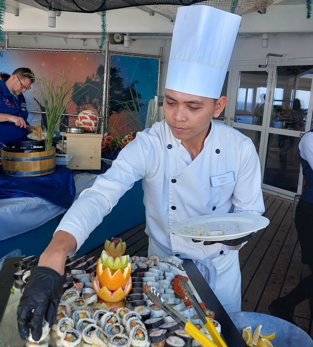 Als wir gegen 18:00 Uhr, als die Grillstation gerade eröffnet hatte, uns das Angebot ansahen, stand zufällig Aleksei Anisimov, der Küchenchef, hinter dem Grill. Doris fragte, ob der Sauerrahm wieder mit Knoblauch versetzt sei. Er beantwortete die Frage mit einem freudigen „Ja“, sah aber sofort Doris‘ enttäuschte Mine. Spontan bot er an, die Küche anzuweisen, für uns eine knoblauchfreie Version zuzubereiten. Gerne nahmen wir das Angebot an und als wir zur gewohnten Zeit um halb acht Bratwurst und Kartoffeln auf dem Teller hatten, bekam jeder von ein Schälchen knoblauchfreien Sauerrahm, das schon für uns bereitstand.