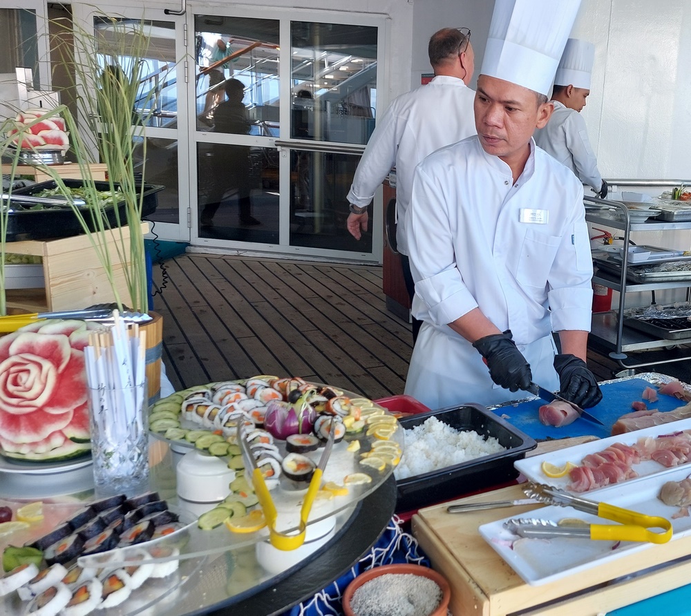 Und solche oder ähnlich Festivitäten, wie das heute angebotene Fisch-Buffet, wird es in den nächsten 5 Tagen, während wir in den verschiedenen Hawaiianischen Häfen liegen, nicht geben.