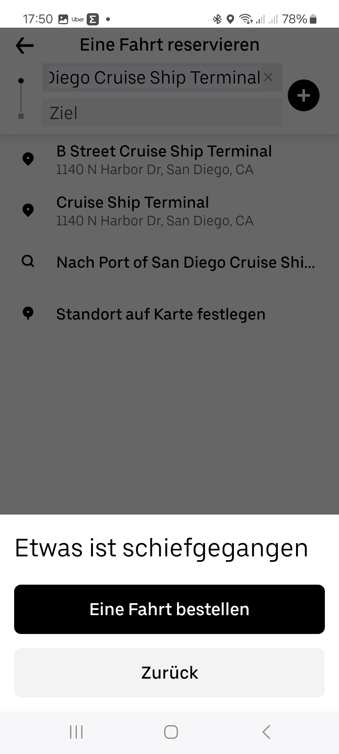 Sowohl der Startpunkt (Port of San Diego Cruise Ship Terminal) als auch das Ziel (San Diego Internation Airport) war der App zwar wohlbekannt, trotzdem verweigerte sie den Dienst, ohne genau zu artikulieren, wo der Schuh drückt.