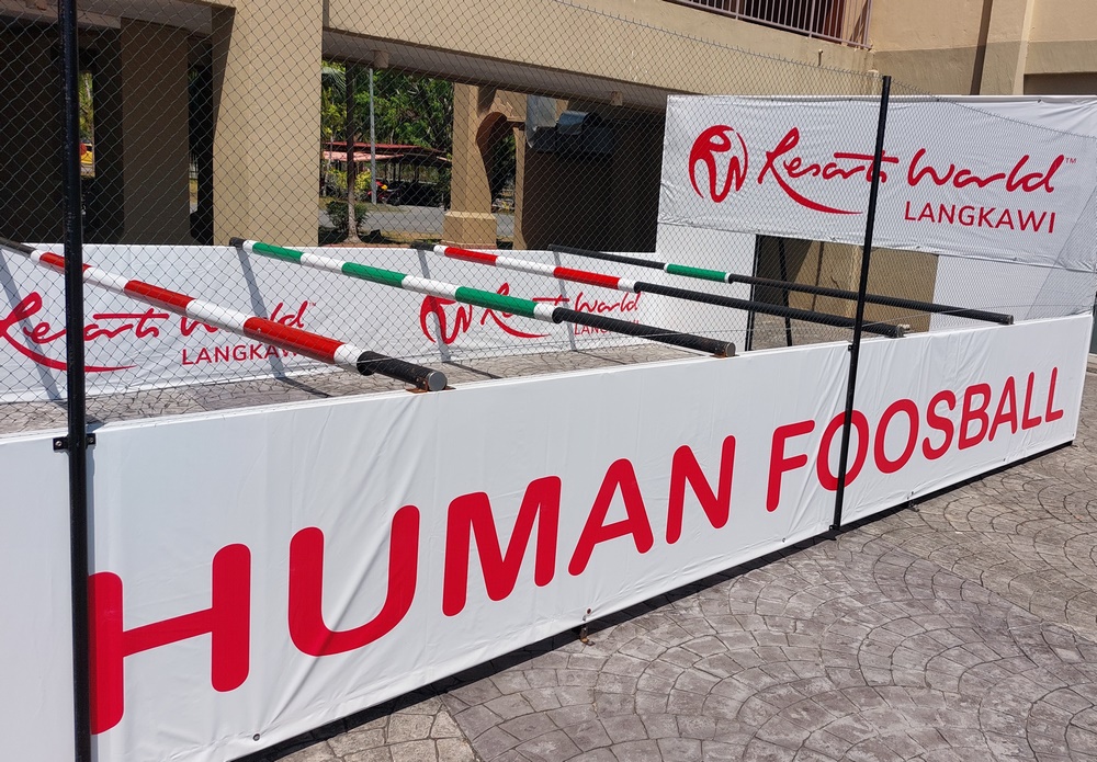 Bei diesem menschlichen Tischfußball gefiel uns besonders die Verschmelzung des deutschen Wortes "Fuss" und dem englischen "foot", vor allem weil eigentlich soccer gemeint ist [Klugscheiß Ende].