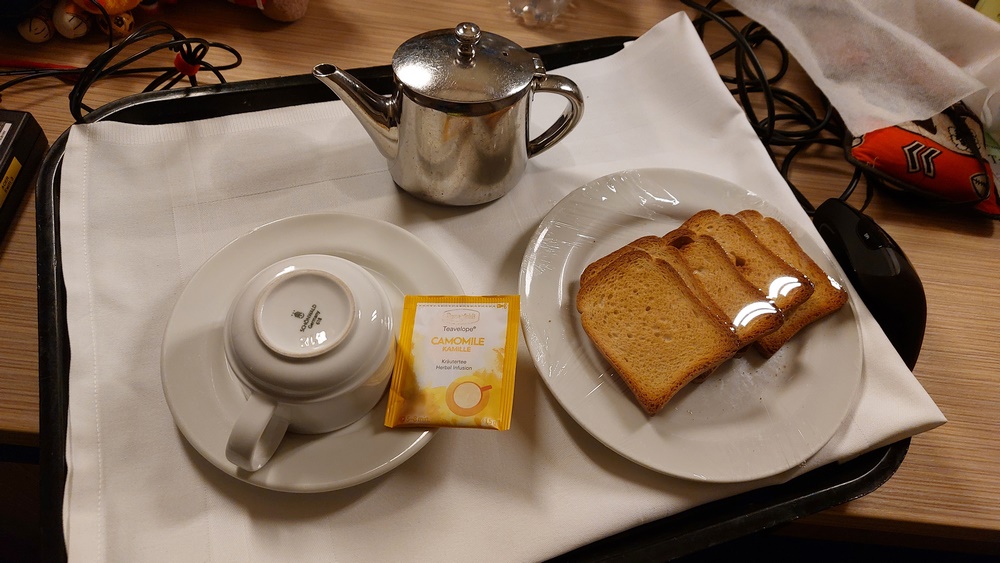 Über den Kabinenservice wurde Zwieback und Kamillentee gebracht.