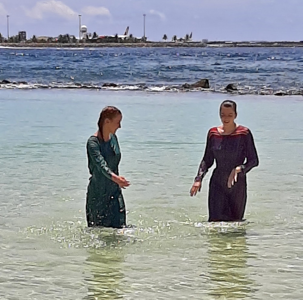Zwei Damen vom ARTANIA-Show-Ensemble beim Bad in der Lagune, wie für Frauen vorgeschrieben mit der den ganzen Körper bedeckenden Badebekleitung. "Normale" Badeanzüge" und Bikinis sind nur auf den Touristen-Inseln und Ressorts erlaubt. Die Beschränkungen gelten selbstredend nicht für Männer.