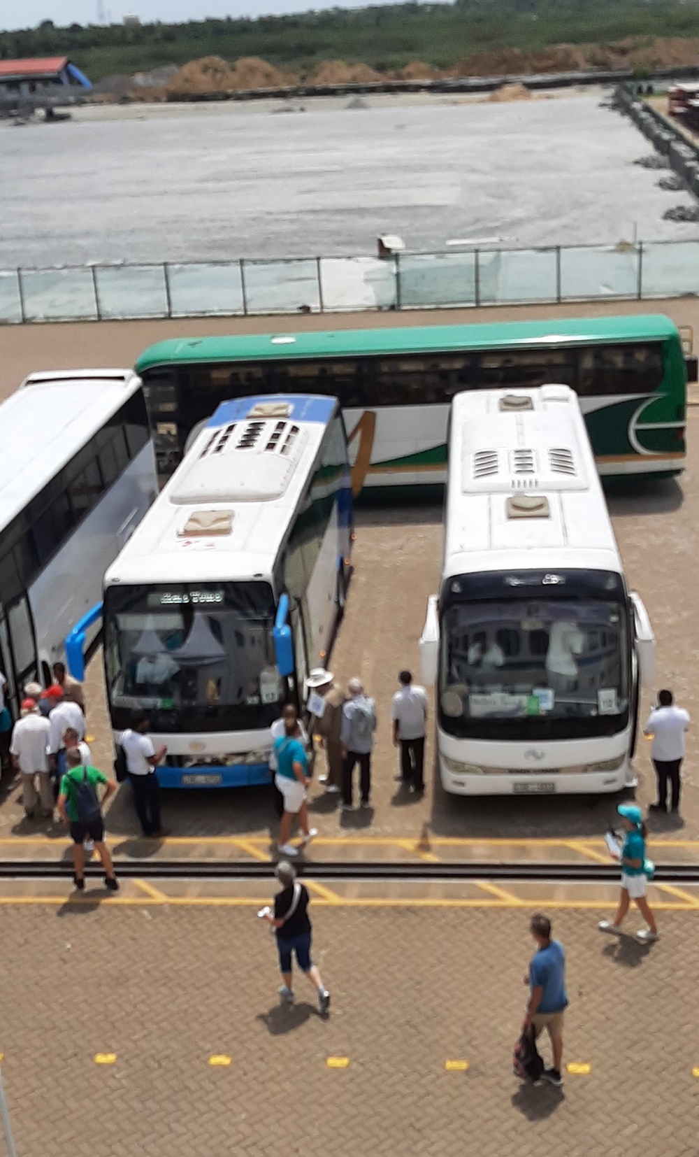 Gemäß einer Durchsage heute früh sollten am Hafenausgang Taxen und Tuk-Tuks auf Kundschaft warten. Es schien uns sinnvoller, von dort unser Unternehmen zu starten, denn aus Erfahrung wissen wir, dass Tourenanbieter, die direkt am Anleger positioniert sind, sich nicht darauf einlassen nur von A nach B zu fahren.