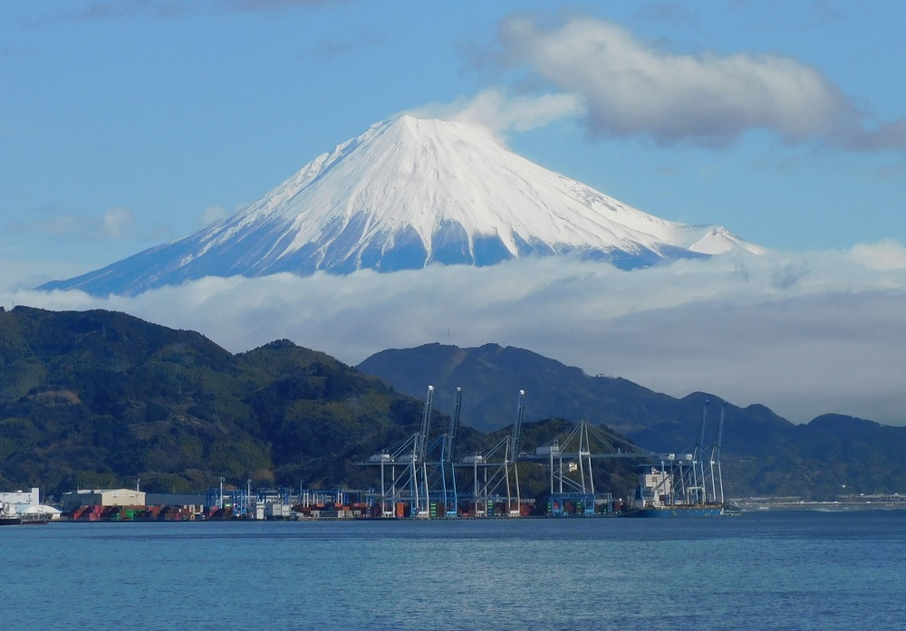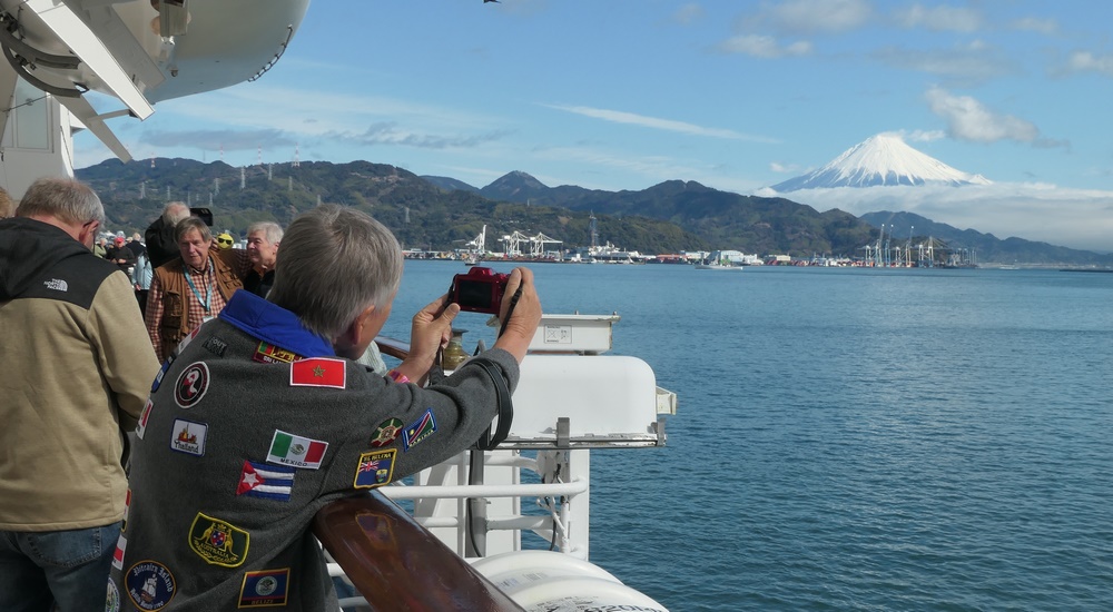 Als wir aber nach dem Frühstück, so gegen 9:30 Uhr, über das Promenadendeck zurück zu unserer Kabine marschierten, hatte das Wetter aufgeklart und der Fuji zeigte sich in seiner vollen Pracht.